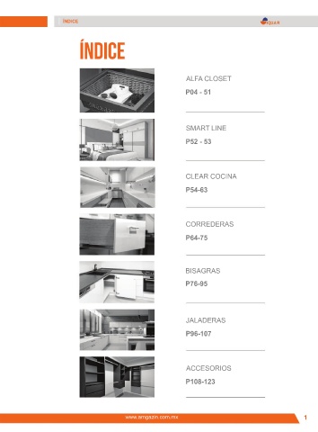 ÍNDICE ÍNDICE ALFA CLOSET P04 - 51 SMART LINE P52 - 53 CLEAR COCINA P54-63 CORREDERAS P64-75 BISAGRAS P76-95 JALADERAS P96-107 ACCESORIOS P108-123 www.amgazin.com.mx 1