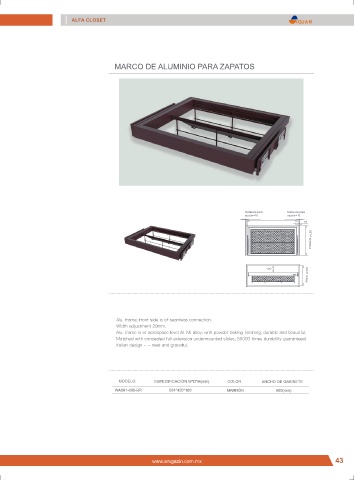 ALFA CLOSET MARCO DE ALUMINIO PARA ZAPATOS Distancia para Distancia para ajustar=10 ajustar=10 Profunda Altura MODELO ESPECIFICACIÓN W*D*H(mm) COLOR ANCHO DE GABINETE WA081-600-BR 564*420*160 MARRÓN 600(mm) www.amgazin.com.mx 43