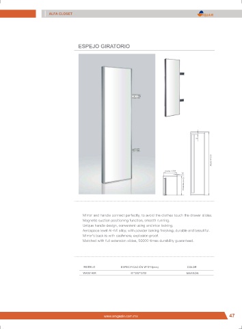 ALFA CLOSET ESPEJO GIRATORIO Altura Ancho = Profunda MODELO ESPECIFICACIÓN W*D*H(mm) COLOR WA001-BR 61*352*1200 MARRÓN www.amgazin.com.mx 47