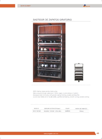 ALFA CLOSET BASTIDOR DE ZAPATOS GIRATORIO MODELO ESPECIFICACIÓN W*D*H(mm) COLOR ANCHO DE GABINETE WA161-800-BR 10CAPAS / 718*360* (1795-1695) MARRÓN 764mm) www.amgazin.com.mx 49