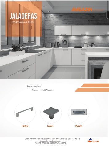 JALADERAS Tendencias en diseño Barra Jaladeras Botones Perfil Aluminio P2910 K2071 P2229 Call 8 #2719 Colón Industrial C.P 44940 Guadalajara, Jalisco, Mexico ventas@amgazin.com.mx Tel: +52 (33) 3162-0001/(33)2465 6257